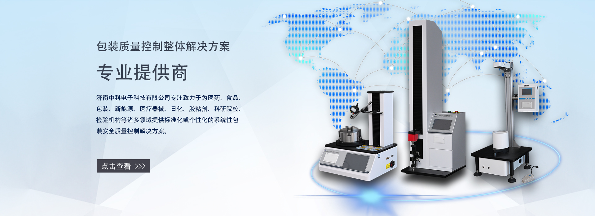 濟南中科電子科技有限公司是一家集包裝及膜材檢測儀器的研發(fā)、制造、銷售和服務為一體的專業(yè)科技公司。專注致力于為食品、醫(yī)藥、包裝、新能源、醫(yī)療器械、石化、日化、膠粘劑、科研院校、檢驗機構等諸多領域提供標準化或個性化的系統性包裝及膜材質量控制解決方案。